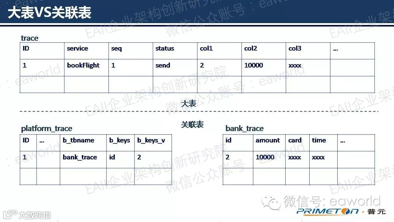 对于一个通用的补偿框架来说,预先知道微服务需要记录的业务要素是不可能的。那么就需要一种方法来保证业务流水的可扩展性,这里介绍两种方法:大表和关联表。