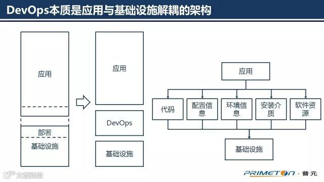 从技术角度讲,DevOps首先要做到的是应用和基础设施解耦。之前我们的应用部署过程,耦合了太多的下层基础设施,包括各种配置(操作系统、数据库、应用服务器、消息服务器、路由等等)。让每一次的应用部署过程变成一个非常繁杂的过程,需要来回的验证和多方的确认。