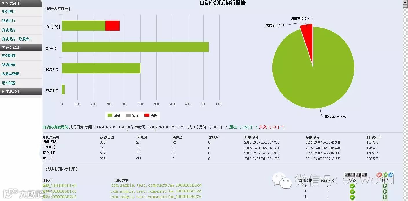 我们将统一测试平台门户设计为一类领域系统,可以上传我们的测试案例部署,选择案例点击执行即可。每个案例的运行其实就是相应手工测试的一次回放。案例执行完成会形成详细的测试报告,包含了成功、错误、异常的详细信息,案例统计图,以及案例执行时间。清晰明了地达成便捷测试。