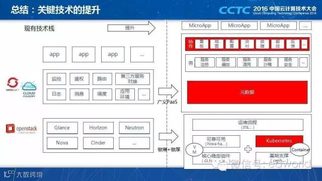 答:我们在这些年来做了很多企业的数字化转型工作,一般都是使用微服务架构,而使用好这一架构,从 IT 精益运营的角度出发。今天我们主要讲了架构提升、提高治理效率、提高协作效率,其中架构提升采用Kubernetes + OpenStack 的模式替代了 OpenStack + CloudFoundry ,同时利用元数据技术提高微服务架构的治理效率,整合了 DevOps 工具链提高协作的效率。