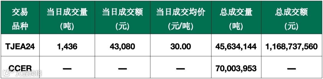 截至今日,天津碳市场配额累计成交45,634,144吨,成交金额1,168,737,560元;CCER累计成交70,003,953吨。