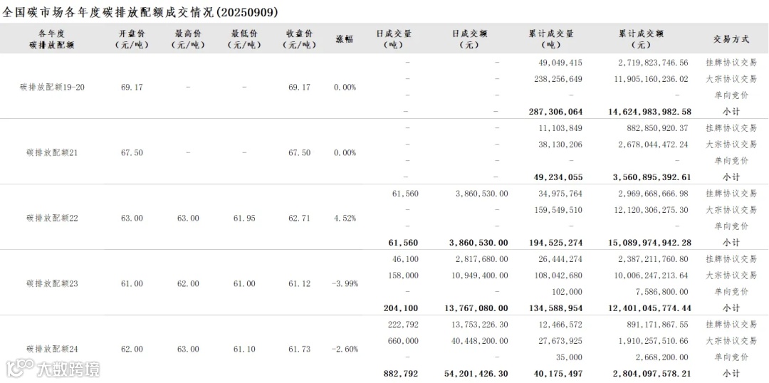 2025年1月1日至9月9日,全国碳市场碳排放配额成交量75,561,180吨,成交额5,448,270,566.61元。
