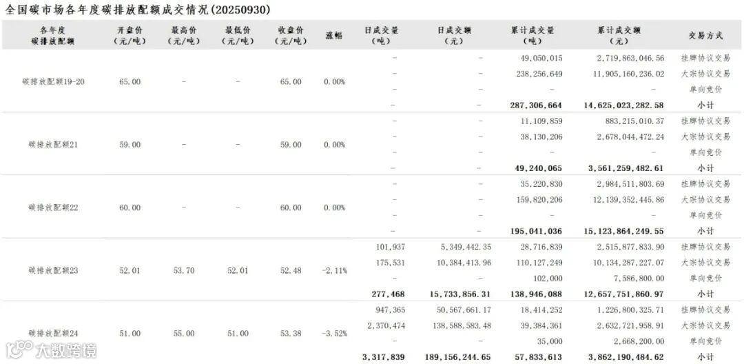 截至2025年9月30日,全国碳市场碳排放配额累计成交量728,367,466吨,累计成交额49,830,089,360.33元。