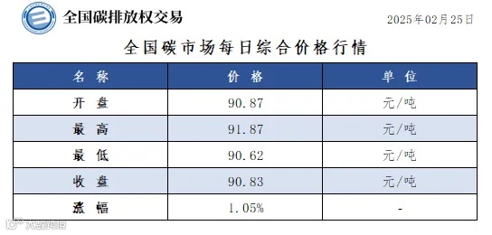 今日全国碳市场综合价格行情为: 开盘价90.87元/吨,最高价91.87元/吨,最低价90.62元/吨,收盘价90.83元/吨,收盘价较前一日上涨1.05%。