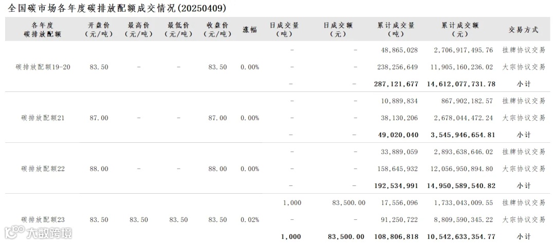 2025年1月1日至4月9日,全国碳市场碳排放配额成交量7,214,862吨,成交额618,520,178.67元。