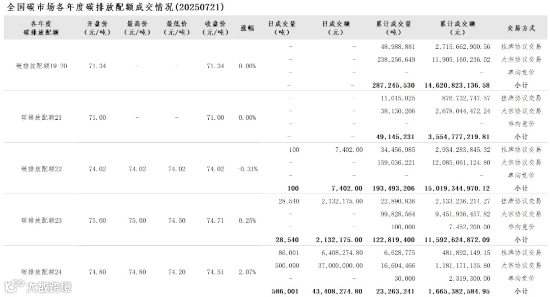 2025年1月1日至7月21日,全国碳市场碳排放配额成交量45,697,944吨,成交额3,420,225,680.04元。