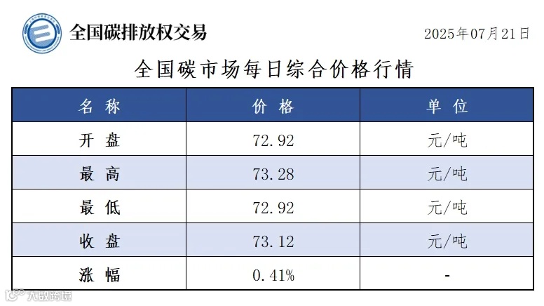 今日全国碳市场综合价格行情为: 开盘价72.92元/吨,最高价73.28元/吨,最低价72.92元/吨,收盘价73.12元/吨,收盘价较前一日上涨0.41%。
