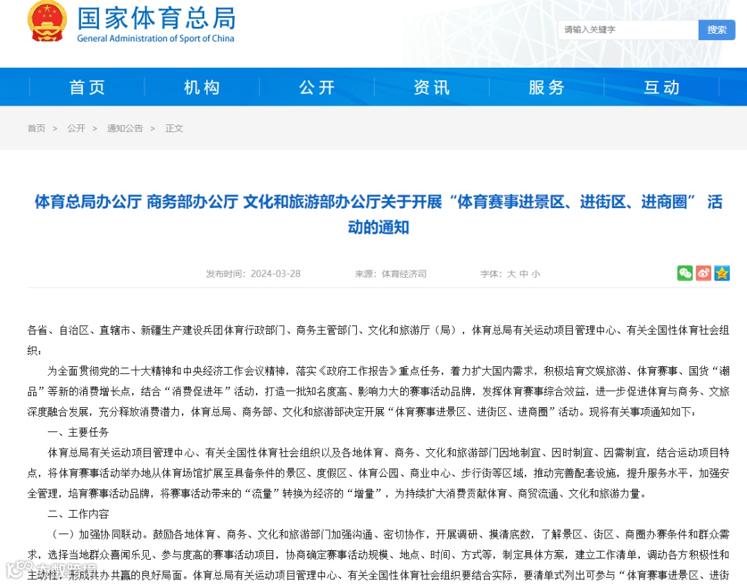 近日,体育总局办公厅、商务部办公厅、文化和旅游部办公厅发布关于开展“体育赛事进景区、进街区、进商圈”活动的通知。