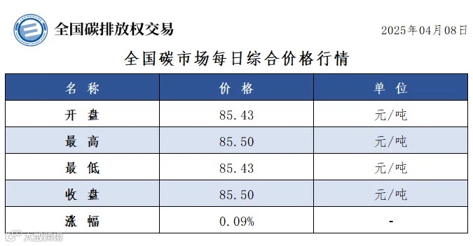 2025年1月1日至4月8日,全国碳市场碳排放配额成交量7,213,862吨,成交额618,436,678.67元。