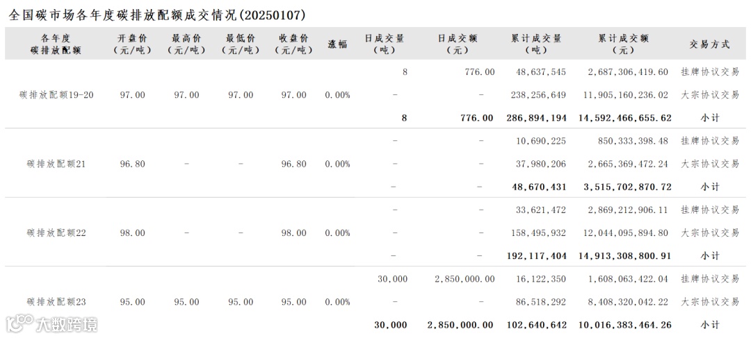 截至2025年1月7日,全国碳市场碳排放配额累计成交量630,322,671吨,累计成交额43,037,861,791.51元。