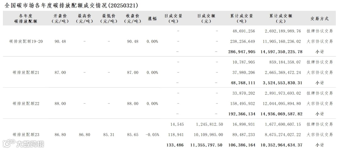 2025年1月1日至3月21日,全国碳市场碳排放配额成交量4,199,650吨,成交额378,211,174.77元。