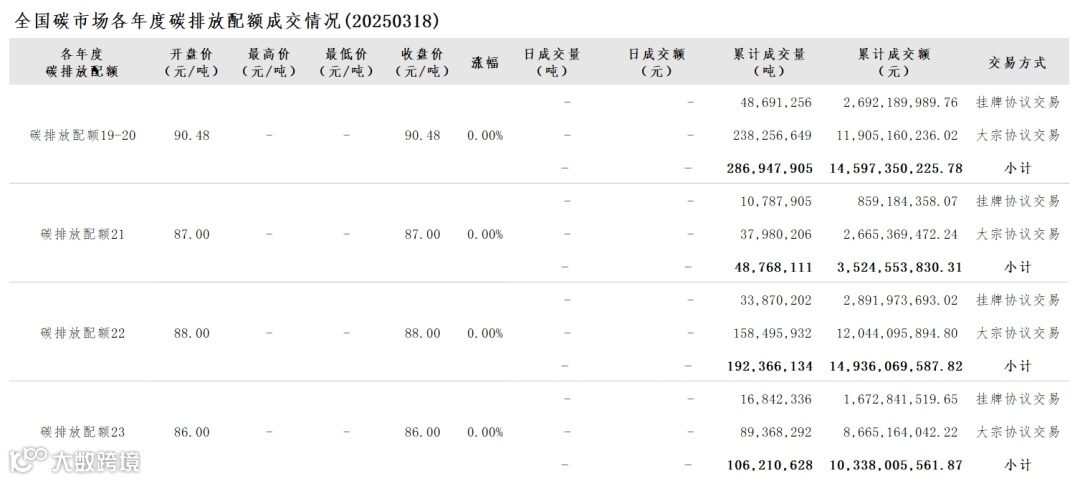 截至2025年3月18日,全国碳市场碳排放配额累计成交量634,292,778吨,累计成交额43,395,979,205.78元。