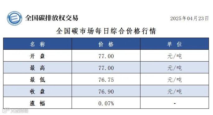 今日全国碳市场综合价格行情为: 开盘价77.00元/吨,最高价77.00元/吨,最低价76.75元/吨,收盘价76.90元/吨,收盘价较前一日上涨0.07%。