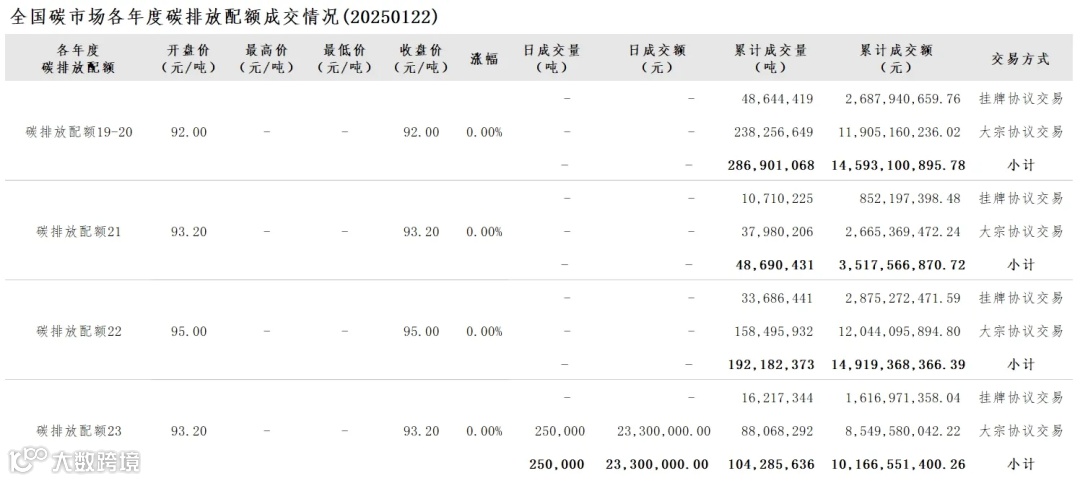 截至2025年1月22日,全国碳市场碳排放配额累计成交量632,059,508吨,累计成交额43,196,587,533.15元。