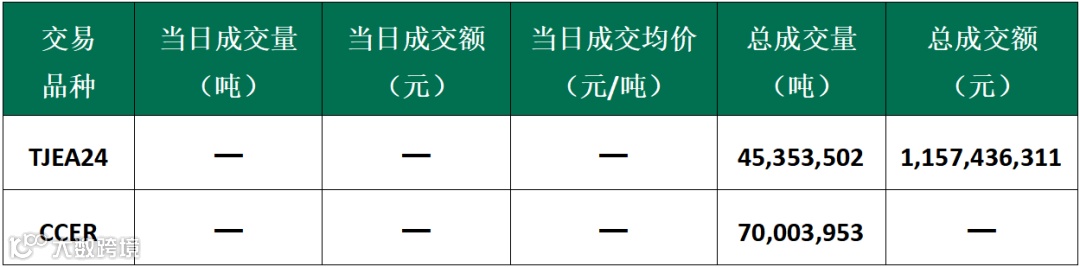 截至今日,天津碳市场配额累计成交45,353,502吨,成交金额1,157,436,311元;CCER累计成交70,003,953吨。