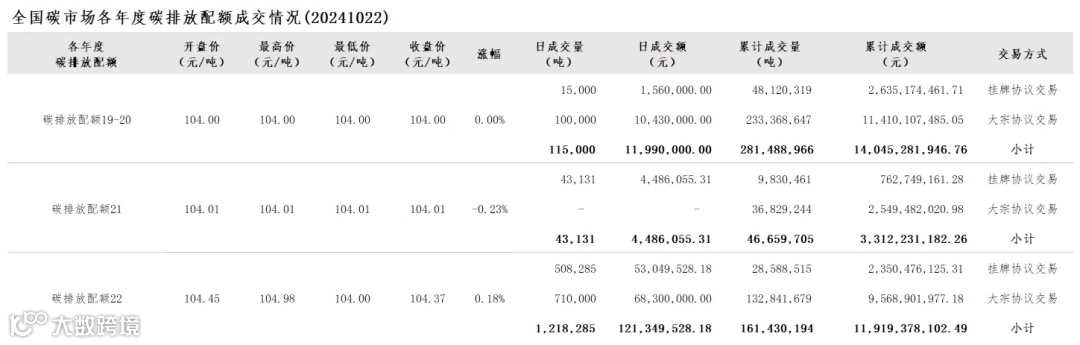 2024年1月1日至10月22日,全国碳市场碳排放配额成交量47,956,254吨,成交额4,357,740,712.23元。