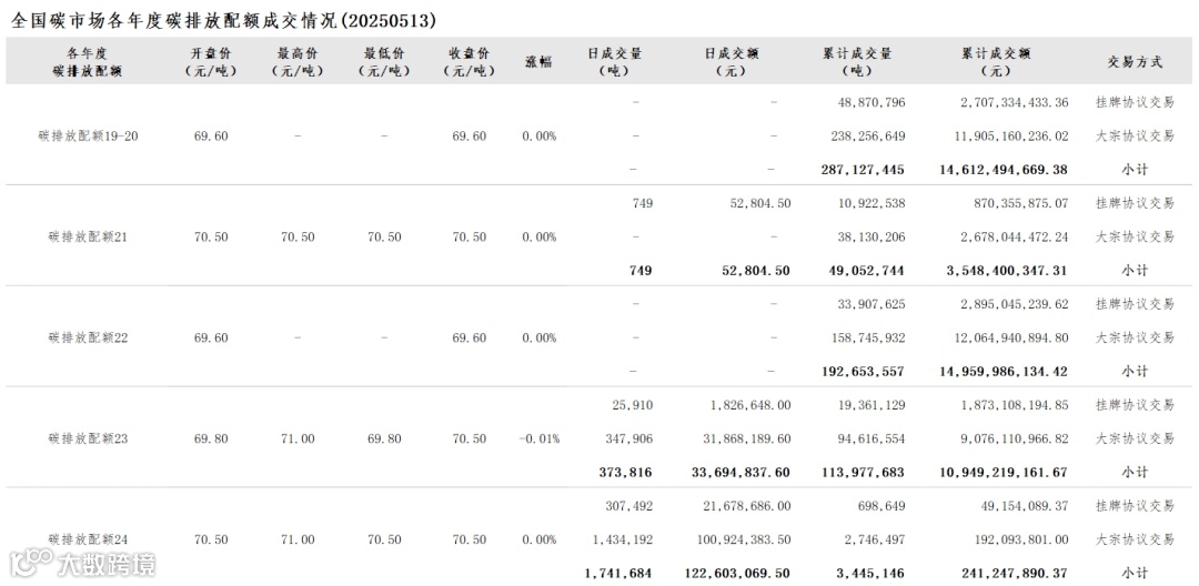 截至2025年5月13日,全国碳市场碳排放配额累计成交量646,256,575吨,累计成交额44,311,348,203.15元。