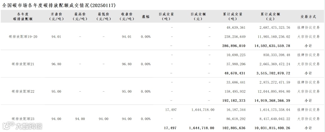 2025年1月1日至1月17日,全国碳市场碳排放配额成交量285,786吨,成交额26,795,093.64元。