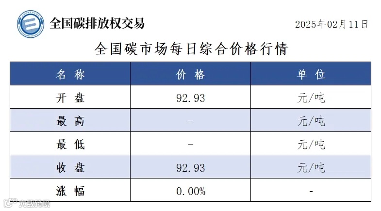 今日全国碳市场综合价格行情为: 开盘价92.93元/吨,收盘价92.93元/吨,收盘价与前一日持平。