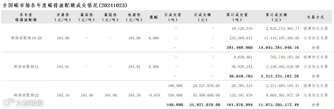 截至2024年10月23日,全国碳市场碳排放配额累计成交量490,125,665吨,累计成交额29,332,818,301.51元。