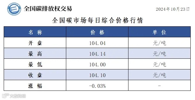 今日全国碳市场综合价格行情为: 开盘价104.04元/吨,最高价104.14元/吨,最低价104.00元/吨,收盘价104.10元/吨,收盘价较前一日下跌0.03%。