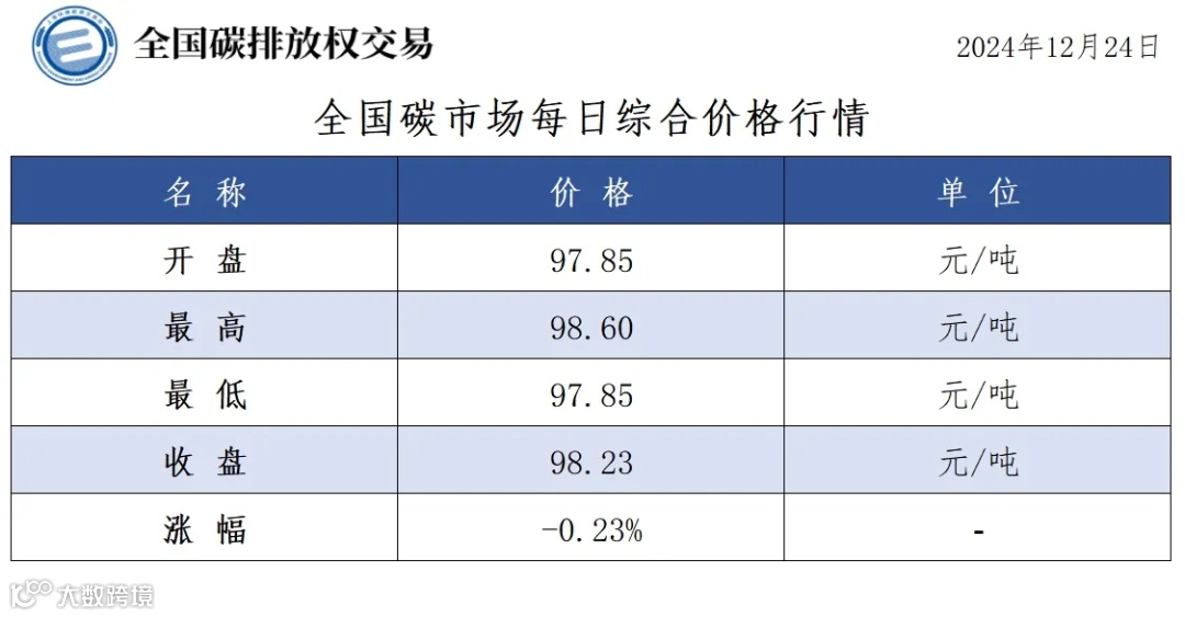 今日全国碳市场综合价格行情为: 开盘价97.85元/吨,最高价98.60元/吨,最低价97.85元/吨,收盘价98.23元/吨,收盘价较前一日下跌0.23%。