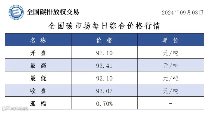 今日全国碳市场综合价格行情为: 开盘价92.10元/吨,最高价93.41元/吨,最低价92.10元/吨,收盘价93.07元/吨,收盘价较前一日上涨0.70%。