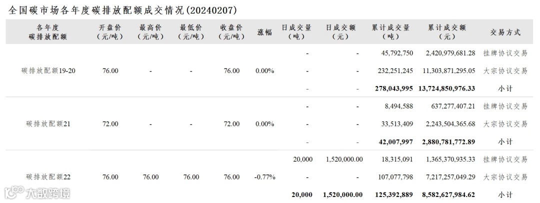 今日全国碳排放配额总成交量20,000吨,总成交额1,520,000.00元。