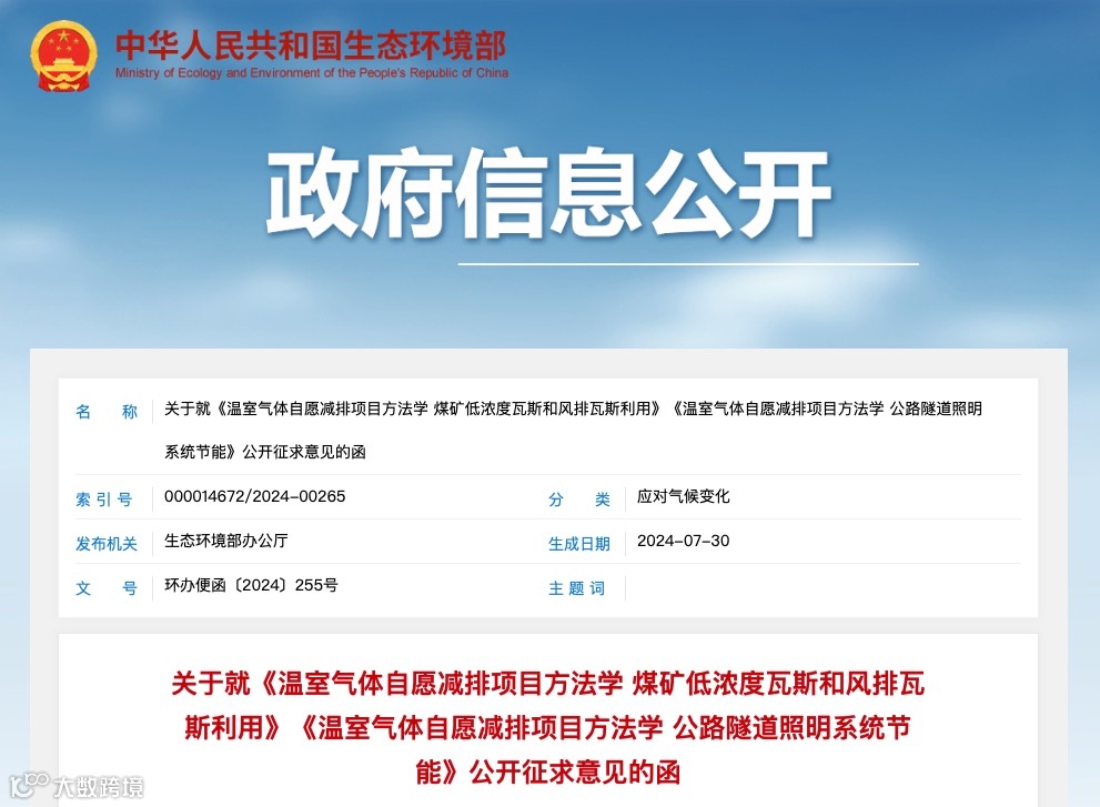 为进一步完善温室气体自愿减排项目方法学体系,鼓励更广泛的行业、企业开展温室气体减排行动,规范温室气体自愿减排项目设计、实施、审定和减排量核算、核查工作,根据《温室气体自愿减排交易管理办法(试行)》,生态环境部组织编制了《温室气体自愿减排项目方法学 煤矿低浓度瓦斯和风排瓦斯利用》《温室气体自愿减排项目方法学 公路隧道照明系统节能》,现公开征求意见。征求意见稿及其编制说明可登录生态环境部网站(http://www.mee.gov.cn)“意见征集”栏目检索查阅。