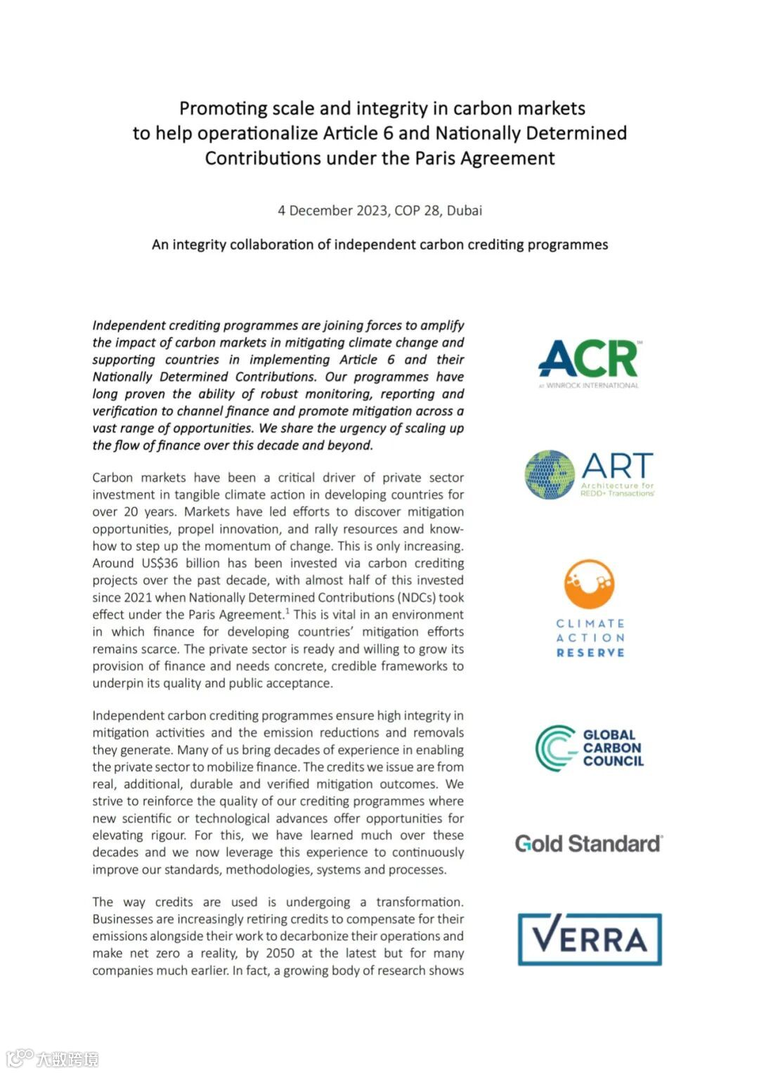 12月4日,VERRA等6家世界领先的独立碳信用标准机构在COP 28峰会上签署联合声明,决定加强合作,以扩大碳市场减缓气候变化的影响力,并支持各国实现《巴黎协定》第六条和国家自主贡献目标。