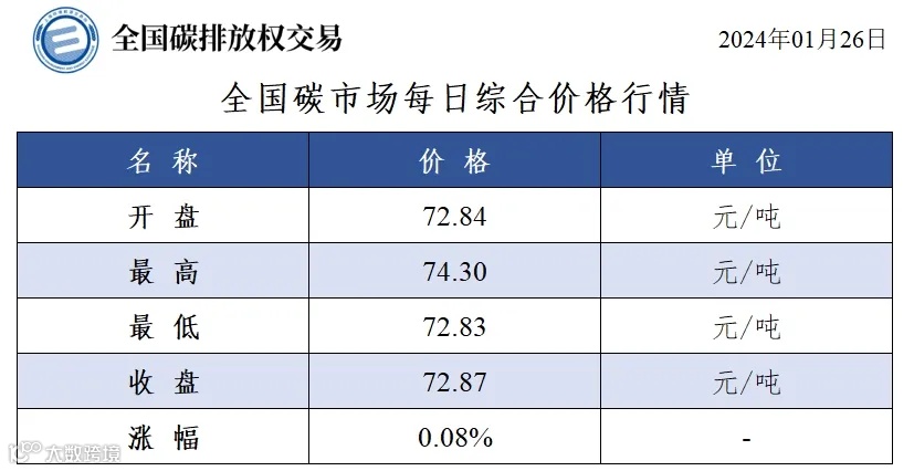 今日全国碳市场综合价格行情为: 开盘价72.84元/吨,最高价74.30元/吨,最低价72.83元/吨,收盘价72.87元/吨,收盘价较前一日上涨0.08%。