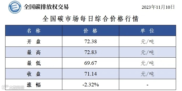 今日全国碳市场综合价格行情为: 开盘价72.38元/吨,最高价72.83元/吨,最低价69.67元/吨,收盘价71.14元/吨,收盘价较前一日下跌2.32%。