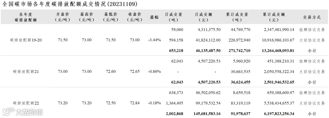 截至今日,全国碳市场碳排放配额累计成交量400,345,802吨,累计成交额21,964,237,882.80元。