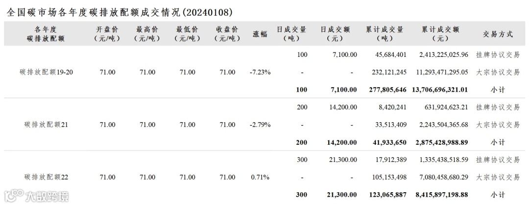 今日全国碳排放配额总成交量600吨,总成交额42,600.00元。