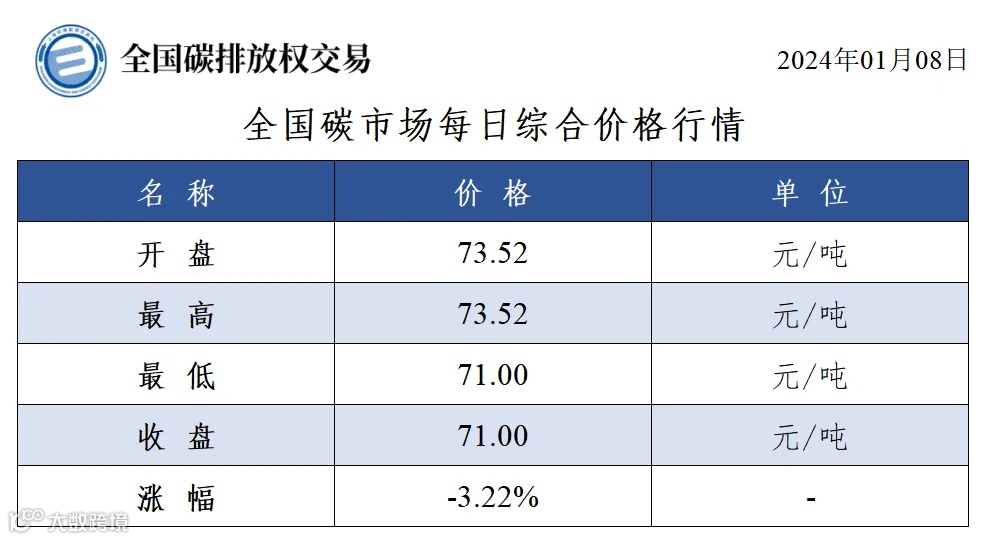 今日全国碳市场综合价格行情为: 开盘价73.52元/吨,最高价73.52元/吨,最低价71.00元/吨,收盘价71.00元/吨,收盘价较前一日下跌3.22%。