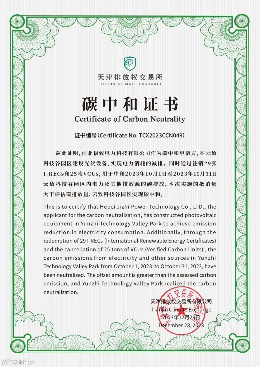 12月28日,天津排放权交易所(以下简称“天排所”)为保定·云致科技谷颁发了碳中和证书,助力其成为河北省首个可再生能源“碳中和”智慧园区。在本次碳中和评价过程中,天排所联合专业机构,严格按照《ISO14064:2018》标准,对园区的温室气体排放量进行核查,并结合相关标准对其碳中和状态出具评价。