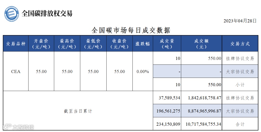 【碳市行情】2023年4月28日全国碳市场成交数据
