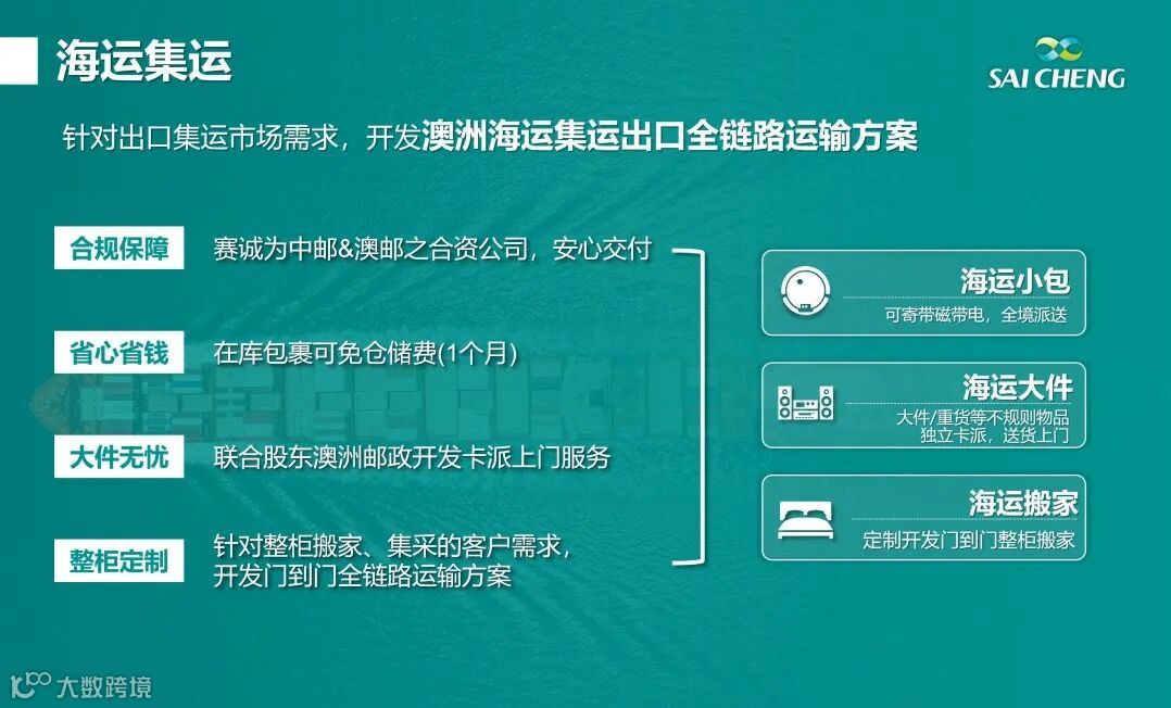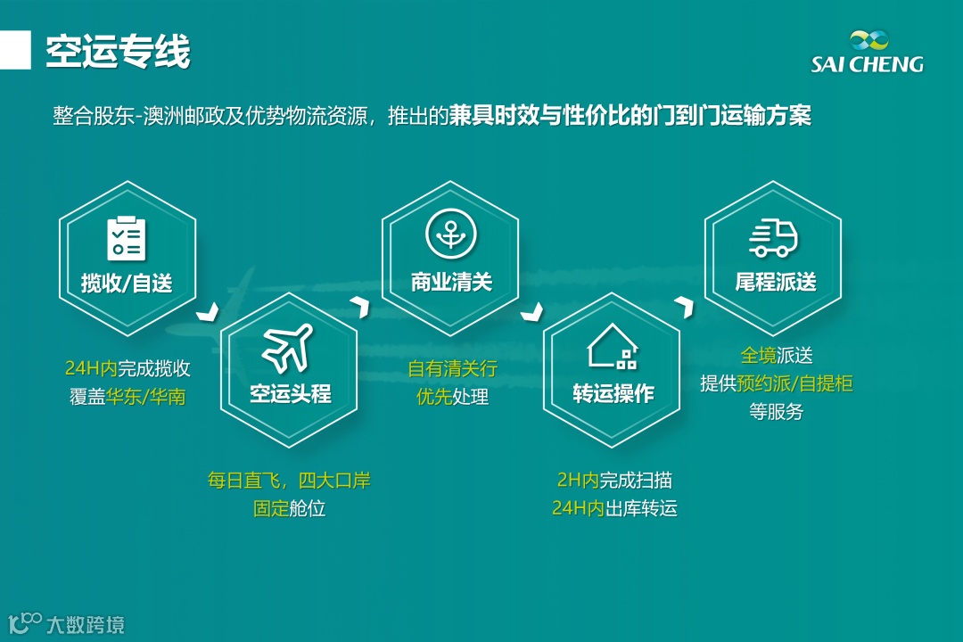 赛诚作为中国邮政和澳大利亚邮政之合资公司,同时也是澳大利亚邮政在中国唯一的物流合资公司。18年来深耕澳洲市场,针对不同跨境电商的客户需求,提供空运和海运两种运输方式,帮助跨境电商客户全线进澳。
