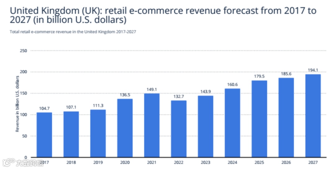 根据Statista数据显示,英国电商市场未来将继续扩大,预计2024年电商规模将达到1606亿美元,到2027年,将达1941亿美元。