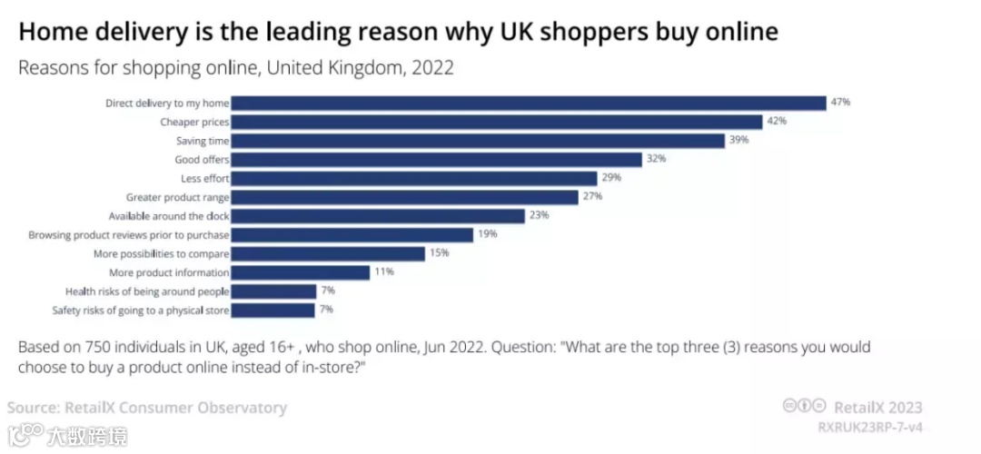 在网购驱动因素上,英国消费者首选因素是送货上门(47%)、更便宜的价格(42%)和节省时间(39%),其它重要因素包括良好的优惠(32%)、更省力(29%)和更多的商品选择(27%)。