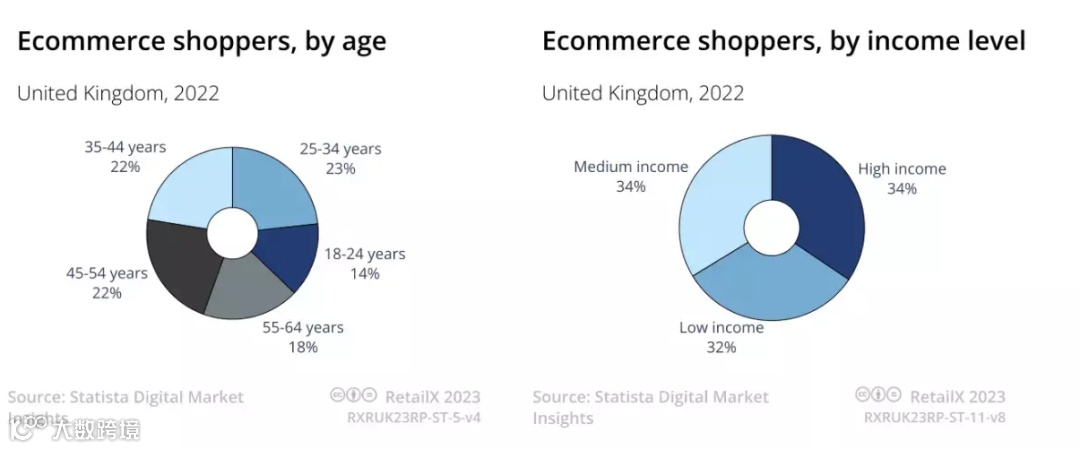 根据RetailX调查数据,在英国,女性网购消费者(51%)比例略多于男性(49%),与英国人口结构相吻合。所有年龄段和收入水平的消费者都在网上购物,中青年(25-54岁)的消费者占比最大,并且这三个年龄段的占比分布较为平均。此外,低收入消费者的网购水平几乎与中、高收入消费者相同。