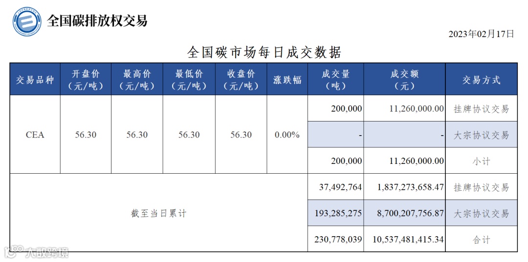 截至今日,全国碳市场碳排放配额(CEA)累计成交量230,778,039吨,累计成交额10,537,481,415.34元。