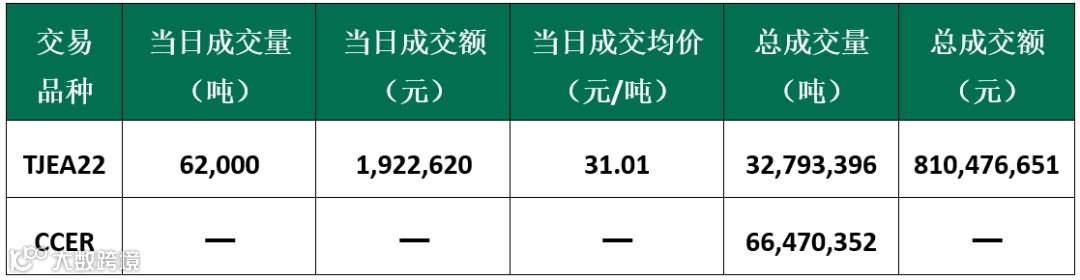 截至今日,天津碳市场配额累计成交32,793,396吨,成交金额810,476,651元;CCER累计成交66,470,352吨。