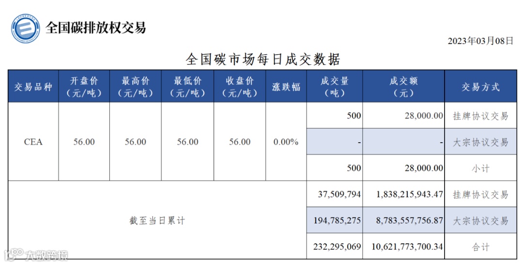 截至今日,全国碳市场碳排放配额(CEA)累计成交量232,295,069吨,累计成交额10,621,773,700.34元。