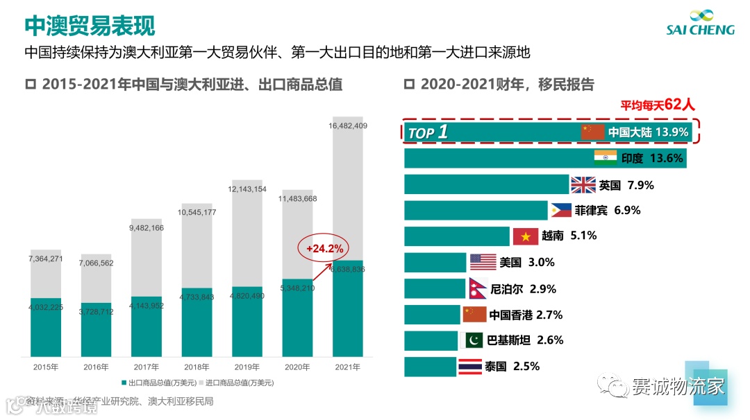 自2010年开始,中国作为澳洲的第一大出口目的地和第一大进口来源地,持续保持为澳大利亚的第一大贸易伙伴。单看2021年,中国对澳大利亚出口商品总值相比上一年同比增长24.2%,也说明了澳洲对中国商品的需求仍在不断增加。