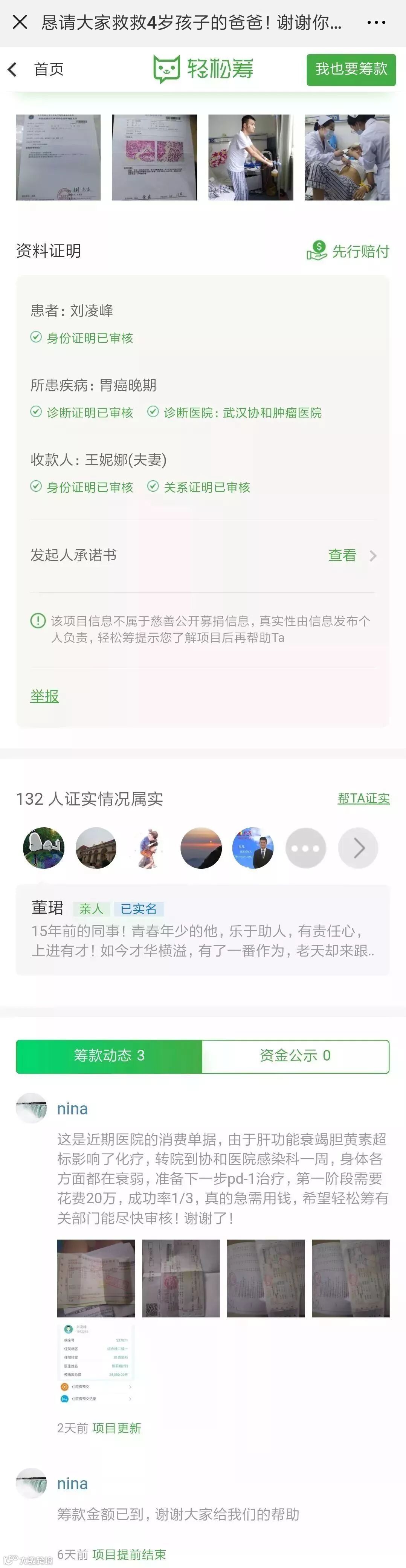 网友爆料,刘凌峰在一周前曾经在众筹平台轻松筹上发起过一次大病众筹,筹集金额为30万: