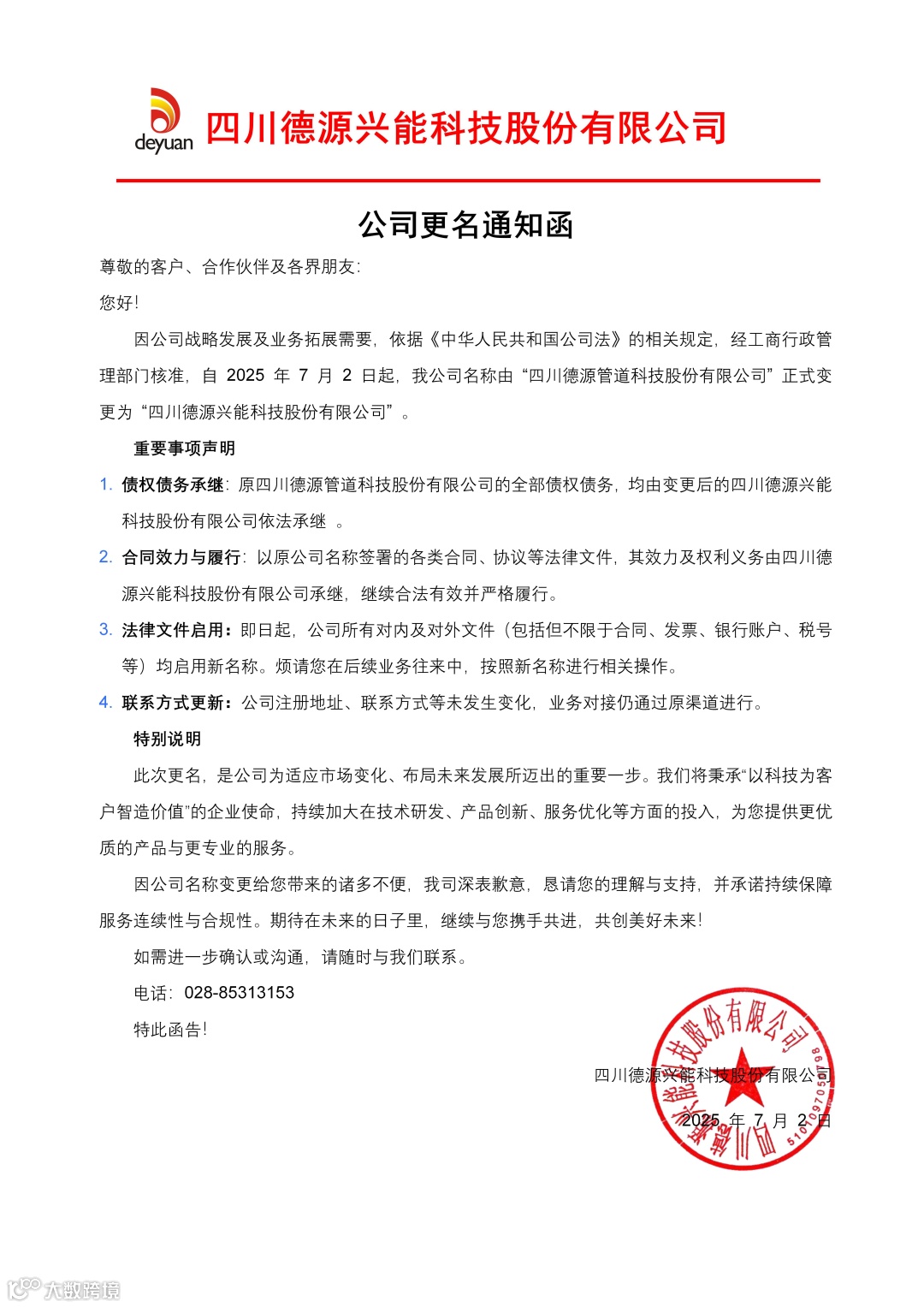 为适应公司战略发展需要,经工商部门核准,自2025年7月2日起,我司正式更名为“四川德源兴能科技股份有限公司”。原公司所有债权债务、合同协议均由新公司依法承继,业务文件将全面启用新名称,注册地址及联系方式保持不变。