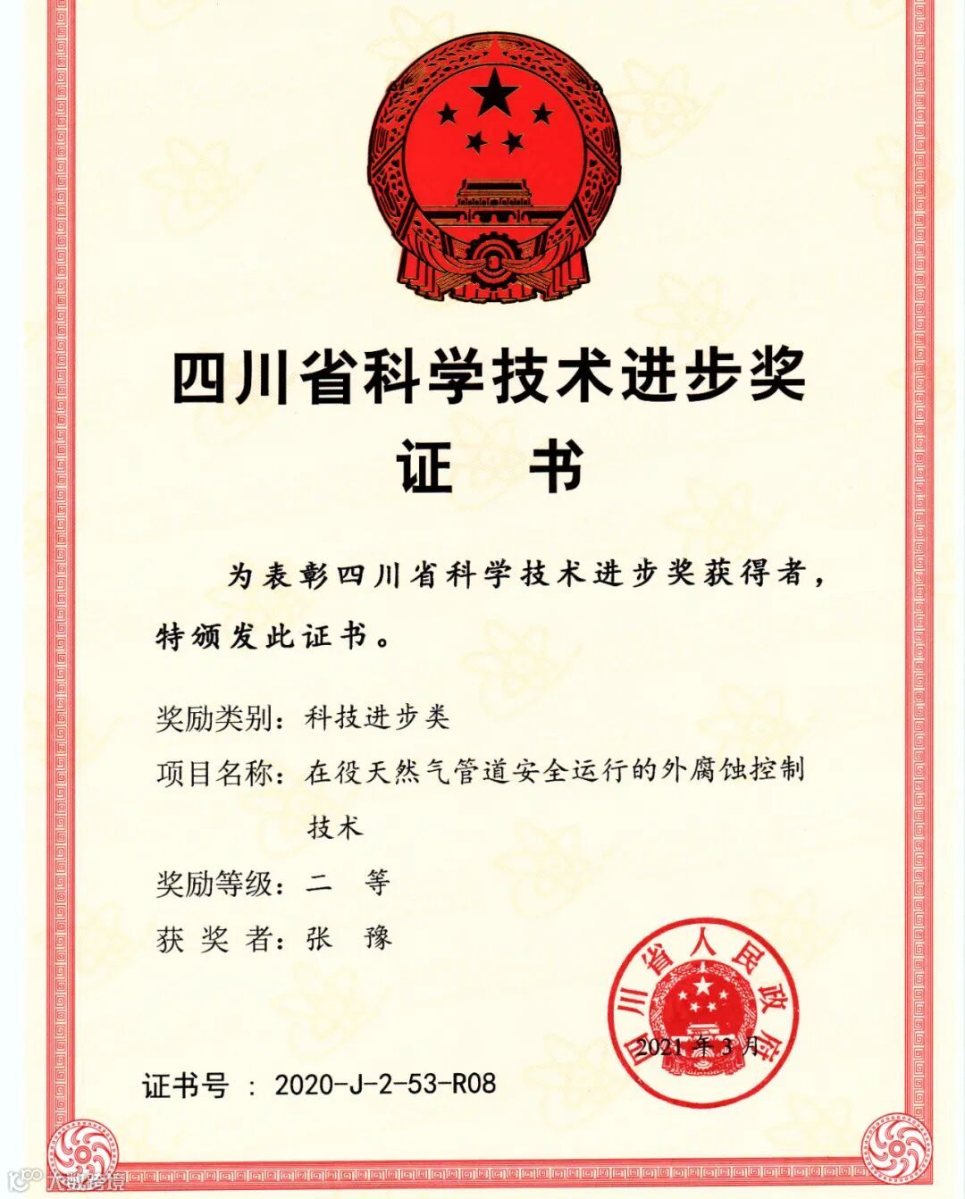 四川德源管道科技股份有限公司联合四川轻化工大学、中国石油天然气股份有限公司西南油气田分公司输气管理处、中国石油天然气股份有限公司西南油气田分公司,历经8年持续研究的《在役天然气管道安全运行的外腐蚀控制技术》荣获四川省科学技术进步奖二等奖。