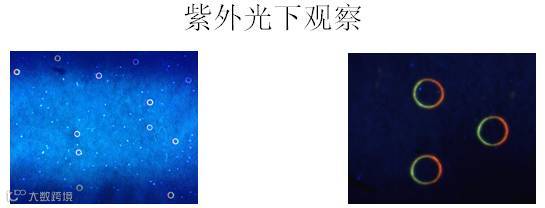 防伪纤维的物理形态呈圆环状随机分布在发票的发票联、抵扣联和记账联专用纸张中,在自然光下观察与普通纸张基本相同,在365nm紫外光照射下,圆环靠近光源的半圆环为红色,远离光源的半圆环为黄绿色(如下图所示)。