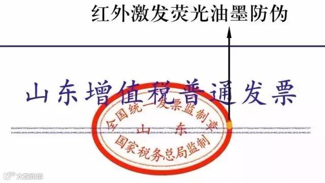 在发票的发票联、抵扣联和记账联专用纸张中含有造纸防伪线,防伪线在自然光下有黑水印的特点,在365nm紫外光照射下,为红蓝荧光点形成的条状荧光带(如下图所示),防伪线据票面右边缘20mm-80mm。